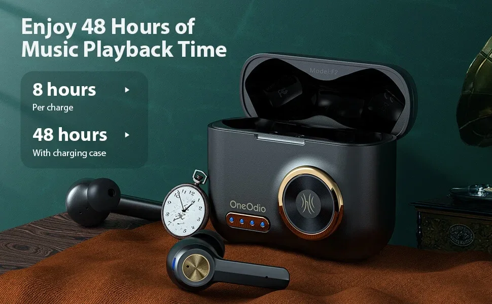 Geniet van kristalhelder geluid en lange speeltijd met de OneOdio F2 Bluetooth Oordopjes. Uitgerust met Bluetooth 5.0 voor stabiele en snelle verbinding, een totale speeltijd van 48 uur met de oplaadcase en AI-ruisonderdrukking voor heldere telefoongesprekken.